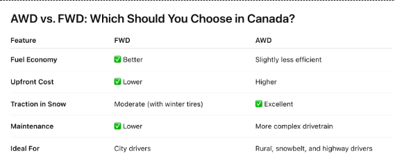 In cities like Ottawa, Toronto, or Vancouver—where roads are well-maintained and regularly plowed—FWD offers dependable performance for daily commutes. -